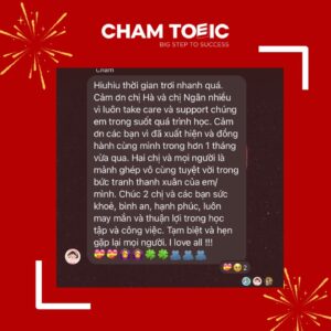 “Học là cả một hành trình, và CHAM TOEIC mong muốn trở thành người bạn đồng hành đáng tin cậy nhất của bạn.” Dấu ấn tại CHAM được viết nên từ chính sự “khác biệt” trong phương pháp, từ “chất lượng” của đội ngũ và trên hết, là từ một “tâm thế phụng sự”, luôn đặt học viên làm trung tâm. Chính những điều đó sẽ giúp CHAM ngày càng phát triển và lan tỏa thật nhiều giá trị tới với hàng ngàn học viên trong tương lai.